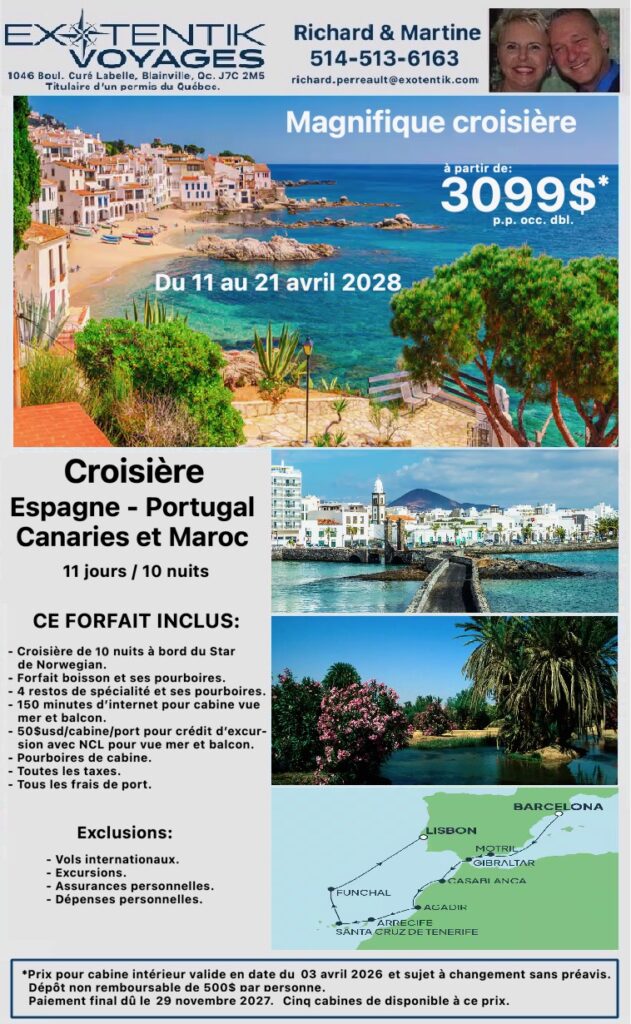 CROISIÈRE DU 11 AU 21 AVRIL 2028 ESPAGNE-PORTUGAL-CANARIE ET MAROC